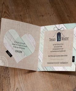 Hippe trouwkaart in mintgroen met steigerhout en hart